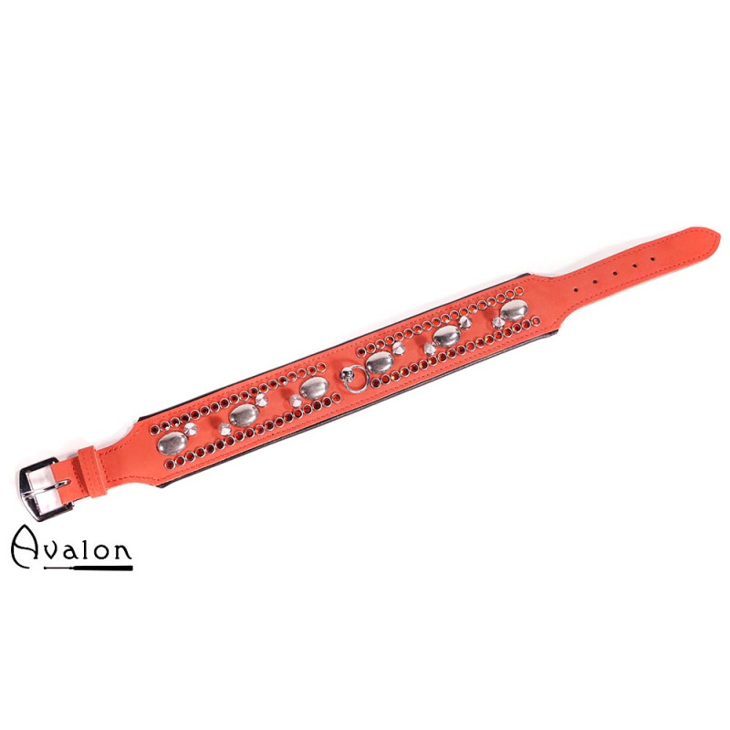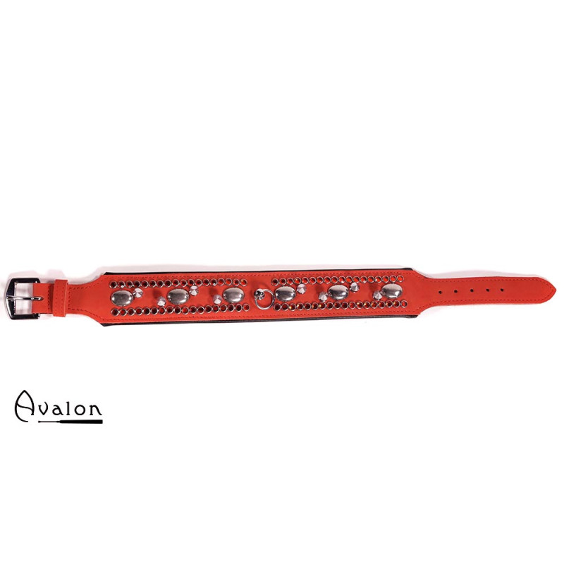 Avalon - WORSHIP - Collar med spisse nagler, ringer og D-ring - Rød og sort