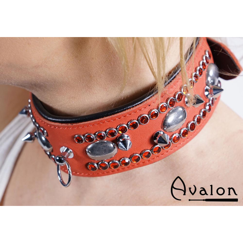 Tags: avalon, lær, collar, halsbånd, hals, bdsm quest, med, spisse, nagler, strass, rød, sort,